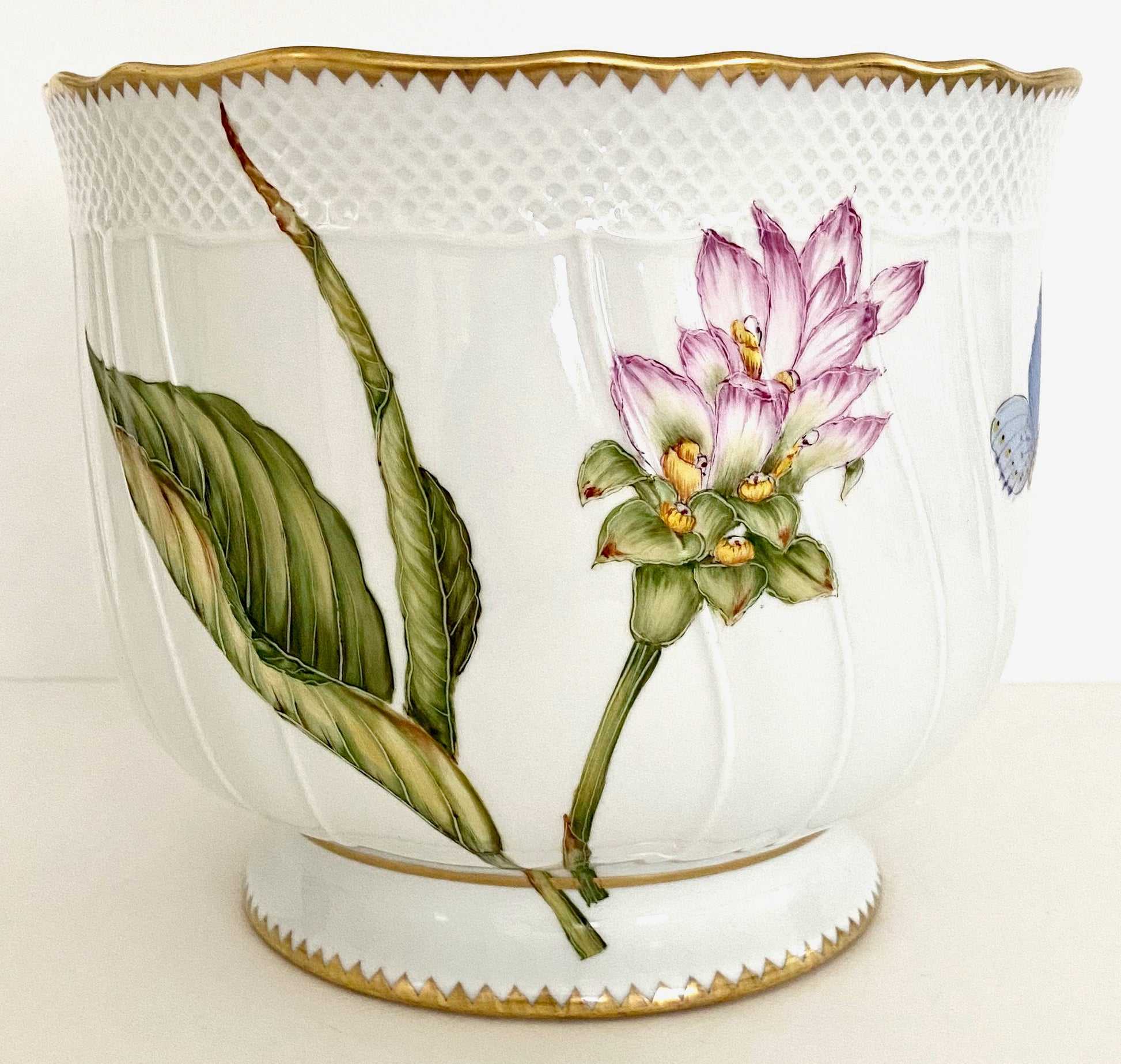 Hungarian hand painted porcelain cachepot/planter with gold border.